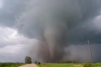 The tornado spawned from a low-precipitation thunderstorm with a high cloud base, making it remarkably visible. Multiple storm chasers captured photographs and footage of the photogenic tornado, which at times dwindled to just 10 feet (3.0 m) in width.[7][1] A photograph of the Ashby–Dalton tornado was used in the cover for the 2021 disaster film 13 Minutes.[13][14]