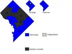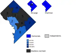 Mayor won reelection in the 2018 election becoming the first mayor to win reelection since 2002.[2] The District of Columbia Home Rule Act states that "not more than two of the at-large members shall be nominated by the same political party" which results in the Democratic Party being unable to run in all at-large districts.[3] David Catania, a member of the city council from 1997 to 2015, was the last member of the Republican Party elected to the council, but changed his political affiliation to independent in 2004.[4]