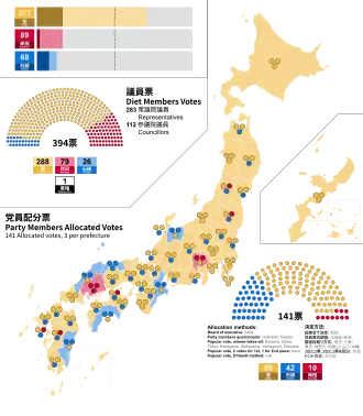 In all other prefectures, Suga prevailed, winning either all three prefectural delegates, or two with the third going to Ishiba, depending on the vote margin of his victory and on whether the primary voting system was d'Hondt proportional, as it was in the majority of prefectures, or FPTP.[23]