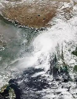 After 3 months of inactivity, on October 11, a depression developed over the west-central Bay of Bengal, though the system was originally observed near the Spratly Islands over the South China Sea on October 6. It continued to move westwards, making landfall in the Khánh Hòa province and further weakened into a low pressure cell while crossing the Indochina Peninsula and re-emerged in the Andaman Sea on October 9. It intensified into a well-marked low-pressure area and then into a depression over the Bay of Bengal on October 10. It further intensified into a deep depression on October 12, remaining practically stationary over the same region.[18][19] After that, BOB 02 moved west-northwestwards and made landfall in Andhra Pradesh near Kakinada in the early hours of October 13 and weakened again into a depression.[20] The system weakened into a well-marked low-pressure area in south-central Maharashtra on the evening of October 14.[21] Though the system's lower-level circulation was partially exposed due to high vertical wind shear and continuous land interaction, the JTWC re-issued a tropical cyclone advisory on October 15. The IMD also forecasted BOB 02 to reintensify in the Arabian Sea.[22][23] The low-pressure area intensified into Depression ARB 03 on the early hours of October 17.[24]