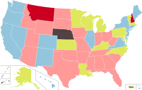 Prior to the November 2020 elections, Democrats held 15 "trifectas" (control of the governor's office and both legislative chambers), Republicans held 20 trifectas, and 14 states have a divided government. Not included in this tally is Nebraska, as its legislature officially recognizes no party affiliations.[81][82] Nationwide, Republicans controlled approximately 60 percent of the legislative chambers and 52 percent of the legislative seats.[83] The 2020 elections created two new trifectas, as the New Hampshire and Montana state government shifted from divided government to Republican control.