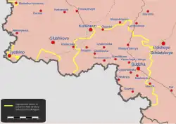In late 2021, Russia massed troops near Ukraine's borders and issued demands to the West including a ban on Ukraine ever joining the NATO military alliance.[27] After repeatedly denying having plans to attack Ukraine, on 24 February 2022, Russian president Vladimir Putin announced a "special military operation", saying that it was to support the Russian-backed breakaway republics of Donetsk and Luhansk, whose paramilitary forces had been fighting Ukraine in the war in Donbas since 2014. Putin espoused irredentist and imperialist views challenging Ukraine's legitimacy as a state, baselessly claimed that the Ukrainian government were neo-Nazis committing genocide against the Russian minority in the Donbas, and said that Russia's goal was to "demilitarise and denazify" Ukraine.[28][29][30][31][32] Russian air strikes and a ground invasion were launched on a northern front from Belarus towards the capital Kyiv, a southern front from Crimea, and an eastern front from the Donbas and towards Kharkiv. Ukraine enacted martial law, ordered a general mobilisation, and severed diplomatic relations with Russia.