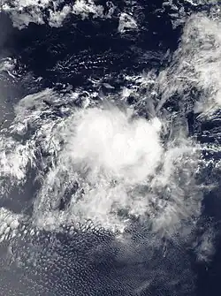 By 4 February, the BoM noted that a weak tropical low may form within the vicinity of Christmas Island, and predesignated it as 17U.[87] The low then subsequently formed by the next day, about 300 km (190 mi) west-southwest of Christmas Island.[88] By 7 February, the JTWC started to monitor 17U, and gave it a medium chance for development within the next 24 hours.[89] The BoM subsequently gave the system a low chance for development in the next 3 days.[90] Under an environment of warm sea surface temperatures, lowering vertical wind shear and fair poleward outflow, the low started to organize, with deep convection wrapping to its low-level circulation center, prompting the JTWC to issue a TCFA by the next day.[91] However, as it moved south-southwest,[92] the wind shear started to increase, leading to its LLCC becoming exposed and the JTWC cancelling the TCFA on 10 February.[93] 17U continued westwards, and was last noted by the BoM on 13 February, before exiting the basin shortly thereafter.[94]