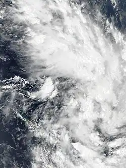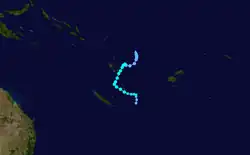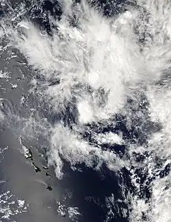 On February 4, the United States Joint Typhoon Warning Center reported that a tropical disturbance had developed within the Australian region about 1,285 km (800 mi) to the west of New Caledonia.[31] The disturbance was starting to develop a low-level circulation, which was accompanied by fragmented atmospheric convection, along a frontal boundary that extended across the Cape York Peninsula and the Coral Sea.[31] Over the next couple of days, the Australian Bureau of Meteorology (BoM) and the Fiji Meteorological Service (FMS) started to monitor the poorly organized system as Tropical Low 18U and Tropical Disturbance 08F, as it moved eastwards within the frontal boundary towards Vanuatu and the South Pacific basin.[32][33][34] During February 7, the system started to slowly consolidate, as it passed to the north of New Caledonia, before the FMS classified the system as a tropical depression.[35][36] At this stage, the depression was moving eastwards and was predicted to continue to move eastwards towards Fiji, however, the depression slowed down as it approached the islands of southern Vanuatu during February 8.