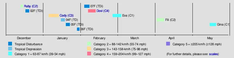 By February, Tropical Low 16U moved over the basin from the Australian region, and was redesignated as Tropical Disturbance 07F. It remained as a disturbance while moving southeast. Tropical Low 18U would also move over the basin, and be redesignated as 08F. 08F would later develop into Severe Tropical Cyclone Dovi, the strongest cyclone of the season. Dovi would later affect New Zealand as an extratropical cyclone. Late on the same month, Tropical Disturbance 09F would form near New Caledonia, and intensify into Tropical Cyclone Eva. Tropical Cyclone Fili would later form on the month of April, peaking as a Category 2 tropical cyclone before moving near New Caledonia and dissipating, and Tropical Cyclone Gina would form in the off-season, in the month of May, peaking as a Category 1 tropical cyclone before dissipating.[12]