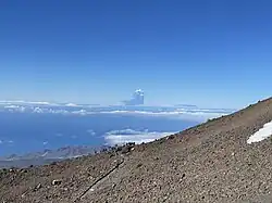 On 26 October, a magnitude 4.8 earthquake under Mazo was also felt in Tenerife, La Gomera and El Hierro.[80] The upper main part of the volcano also had a partial collapse, with the resulting lava flow following the previous flows into the sea.[81]