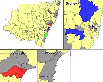 | Lake Macquarie | Labor | Kay Fraser | Jason Pauling | Rosmairi Dawson | Luke Cubis (LMI) | |