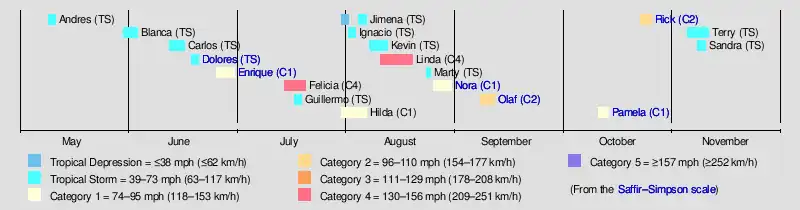 The 2021 Pacific hurricane season began on May 15 in the East Pacific and on June 1 in the Central Pacific.[8] Overall activity included 19 named storms, 8 hurricanes, and 2 major hurricanes. The total of named storms was above the 1991–2020 average, while the number of hurricanes was average, and the sum of major hurricanes was below average.[9] The official start date was preceded by the formation of Tropical Storm Andres, the earliest named storm on record in the East Pacific.[10] It was accompanied by Tropical Storm Blanca later in May.[11] The following month included the formations of tropical storms Carlos and Dolores, in addition to Hurricane Enrique. While Carlos remained away from land, Dolores made landfall on the Mexico coastline and Enrique delivered impacts across southwestern sections of the country while it passed just offshore.[12] Above-average seasonal activity continued into July with the development of hurricanes Felicia and Hilda, Tropical Storm Guillermo, and Tropical Depression Nine-E; none of these cyclones impacted land.[13] In August, Hurricane Nora made landfall along the west-central coastline of Mexico. Its formation was preceded by Hurricane Linda and tropical storms Ignacio, Kevin, and Marty, which did not impact land.[14] September marked a stark turn around to the activity of the previous months, as it only featured Olaf, which struck San José del Cabo as a Category 2 hurricane.[15] Two hurricanes – Pamela and Rick – moved ashore the Mexico coastline in October.[16] An additional two storms, Terry and Sandra, developed in November, the fourth consecutive November with at least one named storm. Furthermore, those cyclones existed simultaneously, the first occurrence in the East Pacific during November on record. The Accumulated Cyclone Energy index for the 2021 Pacific hurricane season as calculated by Colorado State University using data from the National Hurricane Center was approximately 94 units,[nb 4][17] about 30 percent below average.[9]