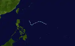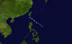 On May 27, the JMA and the JTWC noted the persistence of an area of atmospheric convection about 425 nautical miles (787 km; 489 mi) south-southeast of Guam.[57] The area's nearby environment exhibited low wind shear and warm sea surface temperatures, which were ideal conditions for tropical cyclogenesis.[58] The JMA assessed the area to have developed into a tropical depression on May 29 at 06:00 UTC.[59] The PAGASA made a similar assessment in a Tropical Cyclone Advisory issued at 15:00 UTC.[60] The JTWC later followed with their own assessment, identifying the center of the newly developed tropical depression and assigning the designation 04W.[61] As the system tracked westward, it entered the Philippine Area of Responsibility at 01:00 PHT (17:00 UTC).[62] The PAGASA then named the storm Dante in its first Tropical Cyclone Bulletin for the storm.[63] Dante further organized in the Philippine Sea,[64] and on May 30 at 15:00 UTC, the JTWC upgraded it to a tropical storm,[65] with the PAGASA doing the same at 21:00 UTC.[66] On the next day at 00:00 UTC, the JMA also upgraded Dante into a tropical storm, giving it the international name Choi-wan.[67] Choi-wan's center was exposed due to a tropical upper tropospheric trough from the northeast, inducing shear on the system.[68] On June 1 at 12:30 UTC, Choi-wan made landfall on Sulat, Eastern Samar as a minimal tropical storm,[69] with the JTWC downgrading it to a tropical depression at 15:00 UTC.[70] It made a second landfall on Cataingan at 17:00 UTC.[71] Choi-wan made several more landfalls on the Philippines, making its third landfall on Balud, Masbate at 19:30 UTC. It made a fourth landfall on Romblon, Romblon on June 2 at 00:00 UTC, a fifth on San Agustin, Romblon at 00:50 UTC, a sixth on Pola, Oriental Mindoro at 06:00 UTC, a seventh on Tingloy, Batangas at 11:20 UTC, and an eighth and final landfall on the Calatagan Peninsula before moving into the South China Sea.[72] On June 3 at 03:00 UTC, the JTWC upgraded Choi-wan back to a tropical storm.[73] At 03:00 UTC, the PAGASA removed all Tropical Cyclone Warning Signals as Choi-wan moved away from the country.[74] Choi-wan then exited the PAR on June 3 at 18:00 UTC[75] before weakening into a tropical depression on the next day at 06:00 UTC and re-entering the PAR at 08:00 UTC.[76] Then, it passed southeast of the island of Taiwan[77] before moving out near the Okinawa Prefecture and heading towards Japan. On June 5 at 06:00 UTC, the Japan Meteorological Agency issued their final advisory on the system.[78] 3 hours later at 09:00 UTC, the JTWC upgraded Choi-wan back into a tropical storm,[79] however at 15:00 UTC, the Joint Typhoon Warning Center downgraded the system to a tropical depression, also issuing their final advisory on the system.[80]