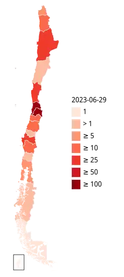 The 2022–2023 mpox outbreak in Chile is a part of the outbreak of human mpox caused by the West African clade of the monkeypox virus. The outbreak reached Chile on 17 June 2022.[2]