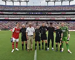The Gunners faced fellow Premier League side Everton at M&T Bank Stadium in Baltimore, Maryland on 16 July. Gabriel Jesus and Bukayo Saka both scored one goal in the first half, helping the team win 2–0.[39] Four days later, Arsenal took on Major League Soccer side Orlando City at Exploria Stadium in Orlando, Florida. The Gunners won 3–1 with Gabriel Martinelli scoring the opener, Eddie Nketiah scoring the second, and Reiss Nelson scoring the third.[40]