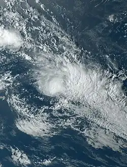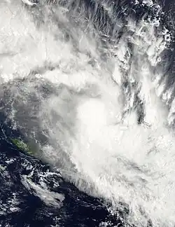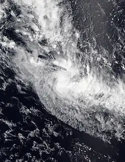By January 17, 05F moved back into the South Pacific basin, where it was upgraded to a tropical depression by the FMS.[42] At 03:00 UTC on January 18, the JTWC's began issuing warnings on the system, classifying it as Tropical Cyclone 09P.[43] The FMS subsequently followed suit, upgrading the system into a Category 1 tropical cyclone on the Australian scale and naming it Irene.[44] At that time, satellite imagery showed Irene was quickly developing a central dense overcast (CDO).[45] Under a favorable environment of warm sea surface temperatures, low wind shear and strong poleward outflow,[46] Irene intensified into a Category 2 tropical cyclone late on the same day.[47] However, as it moved over Tanna Island in Vanuatu, its weakly defined and elongated low-level circulation center quickly became exposed due to the wind shear,[48] prompting the JTWC to issue its final warning on Irene and reclassify the system as a subtropical cyclone by January 19.[49] The FMS subsequently downgraded Irene into a Category 1 tropical cyclone,[50] and continued to issue warnings as it weakened while moving east-southeast, before declaring the system an extratropical cyclone late on the same day.[51] Irene was last noted the next day.[52]