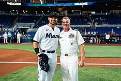 U.S. Navy Capt. Greg Smith (right), chief of staff, Navy Region Southeast, and Miami Marlins catcher Payton Henry, take a photo at a Miami Marlins Major League Baseball game during Fleet Week Port Everglades festivities on May 2, 2022.