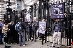 Just Stop Oil activists target buildings used by the Home Office, MI5, the Bank of England and News Corp, spraying orange paint on each and demanding an end to new oil and gas licences.[573]