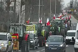 In Poland the farmers' protests began on 9 February 2024 in response to the European Green Deal, along with the importation of Ukrainian grain into Poland and the wider European Union. Polish beekeepers, farmers, truckers and foresters began protesting, with nearly all farmers' unions supporting the protests. Roads and highways have often been blocked by Polish farmers and truckers.[23]
