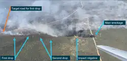 A report of the preliminary investigation released on 3 May 2023 stated that the aircraft had hit a ridge line while dropping retardant at a low altitude. Seconds earlier, the pilots had attempted to pitch the aircraft up, but its engines had not had sufficient time to accelerate. After the aircraft had slid to a rest, the pilots had been able to escape through the left side cockpit window only sustaining minor injuries.[9]