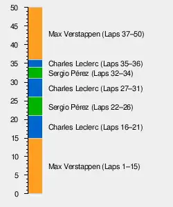 The pair of Verstappen and Leclerc fought for the lead throughout the race along with Sergio Pérez. By the end of the race, Verstappen had a small but comfortable lead with Leclerc and Pérez fighting over second. Leclerc passed Pérez on the final lap to secure second, with Pérez rounding out the podium.[37] The third-place podium handed Pérez second place in the Championship, giving Red Bull their first ever 1–2 in the Drivers' Championship. The two Mercedes drivers also secured their positions in the Drivers' Championship: Lewis Hamilton secured third place by finishing seventh. His teammate George Russell's eighth place finish secured him eighth position in the standings, which marked the lowest Drivers' Championship finish for a Mercedes driver since 2012.[39]