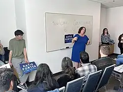 In January 2023, with the question of Feinstein's reelection decision still open, U.S. Representative Katie Porter announced that she would run for the Senate. She confirmed that she would stay in the race even if Feinstein chose to run for another term.[1] Porter was first elected in 2018, unseating incumbent Mimi Walters. She later gained national fame for her progressive politics, and frequently went viral online for her pointed questioning of corporate executives in congressional hearings, often while using a whiteboard.[46] Porter's coastal, Orange County-based district is considered highly competitive, and all of her elections have been close.[47]