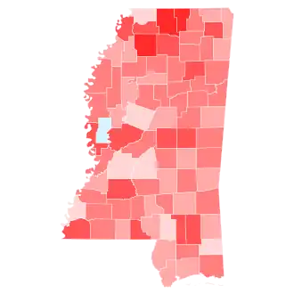 Trump received 60.9% of the vote in Mississippi, winning the state by a 22.9% margin. Harris received 15% less total votes than Biden did, in large part with a decline in turnout from black majority counties on the Mississippi Delta. Collectively, these counties saw a 8% drop in turnout compared to 2020.[25] Trump has flipped the majority black counties of Copiah, Issaquena, Jasper, Pike, Warren, and Yazoo, as well as Marshall and Oktibbeha counties.