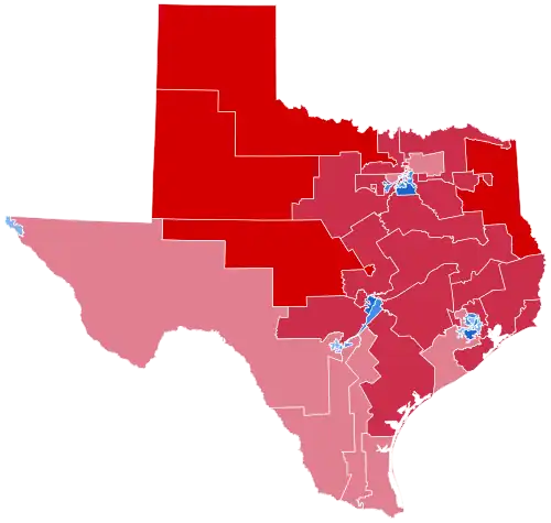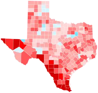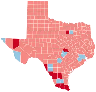 Texas was considered by some to be potentially in play, as the state had not backed a Republican for president by double digits since it favored Mitt Romney in 2012. This increased competitiveness was largely explained by the fast-growing Texas Triangle trending leftwards in some elections, namely in the closely-contested 2018 U.S. Senate race and the 2020 U.S. presidential election, which saw the Metroplex county of Tarrant and the Greater Austin counties of Williamson and Hays flip to the Democratic candidate for the first time in decades. However, in the 2020 state elections, predominantly Hispanic South Texas shifted significantly Republican, a trend that the rest of the state followed in the 2022 midterms.[2][3] In 2024, Trump went on to win Texas by a margin of over 1.5 million votes, the second-largest margin of victory for any presidential candidate in Texas history.[4] Trump won 242 out of the state's 254 counties, the most for a Republican since 1972.