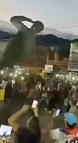 The Venezuelan National Guard dispersed the attendees with tear gas bombs.[48][49][50] Colectivos joined state security agencies in the repression against protesters.[51] In Punto Fijo, protesters set fire to the Carirubana mayor's office and the PSUV regional headquarters at midnight.[52] On the same night, armed militia group Tren del Llano was reported to be involved in a gun fight with the police, military, and the Colectivos in Valle de la Pascua, Guarico state.[53]