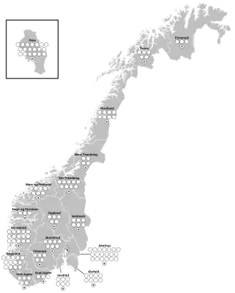 A total of 150 of the seats are regular constituency seats. These are awarded based on the election results in each county, and are unaffected by results in other counties. Nineteen of the seats (one for each county) are leveling seats, awarded to parties who win fewer seats than their share of the national popular vote otherwise entitles them to. A modification of the Sainte-Lague method, where the first quotient for each party is calculated using a divisor of 1.4 instead of 1, is used to allocate both the constituency and leveling seats. A party must win 4% of the popular vote in order to win levelling seats but may still win constituency seats even if it fails to reach this threshold. The system for apportioning seats is biased in favour of rural areas since the area of the county is a factor, but the system of compensation seats reduces the effect this has on final party strength.[25][26]