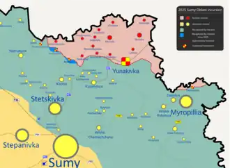 - ^ "Russia attempts to capture Yunakivka and Pysarivka in Sumy Oblast". Yahoo News. 12 June 2025.