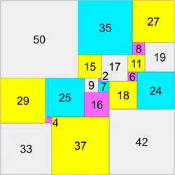 1. ^ This square of side length 7 is adjacent to both the "central square" with side length of 9, and the smallest square of side length 2.