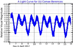 ![]() A visual band light curve for UU Comae Berenices from MOST data. Adapted from Paunzen et al. (2019)[1] | |