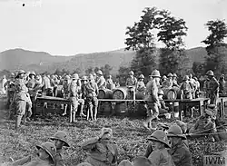 In late July the division was relieved by the 48th Division after having further reinforced the front and reserve lines and conducted trench raids against the Austrians.[54] On 19 August the division returned to the plateau for a planned attack, relieving the 48th Division, and began to conduct trench raids. One of these consisting of over 360 officers and men of 10th Duke of Wellington's Regiment failed to achieve surprise and was strongly opposed, despite this, 70 prisoners were taken for the loss of 2 dead, 48 injured and 6 missing.[55] In September the reorganisation that had been applied to divisions in France in March was now applied in Italy, and each brigade lost one of its battalions. The 13th Durham Light Infantry, 9th Yorkshire Regiment and the 11th Sherwood Foresters left the division on 11 September, eventually to form the 74th Brigade of the reconstituted 25th Division.[56]