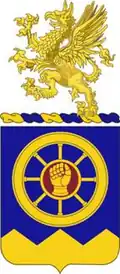 The 246th Transportation Battalion coat of arms and distinctive unit insignia were both approved on 17 April 2008.[2] Both consist of a blue shield with a gold wheel and gauntlet surmounting the brick red hub. The base of the shield consists of a golden yellow dancetté.