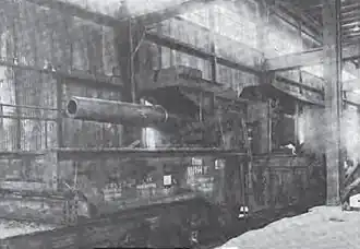 Ammunition was moved by means of an overhead rail from which a pair of shell tongs lifted up individual shells to be placed in the loading tray fixed to the breech. An extensible rail could be raised and braced in place to allow the tongs to reach shells placed on the ground or in an ammunition car behind the mount.[3] The gun had to be at zero elevation to load and thus it had to be re-aimed after every shot. The "Theodor Otto" fired several different shells with weights between 140 and 151 kilograms (309 and 333 lb). It used the German naval system of ammunition, where the base charge was held in a metallic cartridge case and supplemented by another charge in a silk bag which was rammed first.[4]