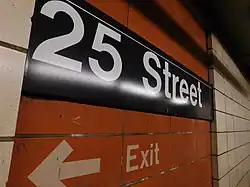 - ^ Cox, Jeremiah (June 5, 2009). "A 25 Street sign above a painted arrow that points towards the station exit, on an orange portion of the platform wall". subwaynut.com. Retrieved December 18, 2018.