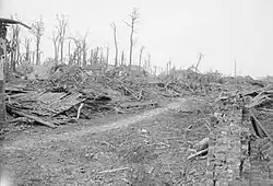 26th RF was relieved on the night of 8/9 October and moved back to 'Factory Trench' in the rear, where it was subjected to more shelling than when it was in the front line. The following night it was moved further back to bivouacs in 'Caterpillar Wood'. Then after a series of train journeys it arrived at La Clytte on 22 October, where it was billeted. After picking up some reinforcement drafts, 41st Division took over a quiet sector of the front on the southern edge of the Ypres Salient under Second Army once more. Here 26th RF established a trench routine of alternating with 21st KRRC: six days in the line, six in support at 'Ridge Wood', six more in the line, and then six in the muddy 'Murrumbidgee Camp' at La Clytte, where it trained and provided working parties. The area was so waterlogged that only shallow trenches could be used, with built-up parapets that required constant maintenance during the harsh winter. There was active raiding by both sides. On 15 December a patrol of 26th RF attacked two German sentries and obtained identification of their unit. Later that night the barrage for a German raiding party caught a wiring party of 26th RF in No man's land and the raiders got into the battalion's front line, where they were driven off by an isolated Lewis gunner, who used his revolver when his gun jammed.[14][34][35]
