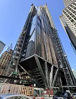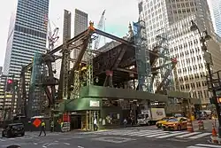 In July 2019, JPMorgan Chase signed an agreement with MTA in which the bank guaranteed that the demolition of 270 Park Avenue would not delay work on East Side Access.[35] That month, scaffolding was wrapped around the tower and podium structure on the Madison Avenue side of the building, the first step in an anticipated 18-month demolition effort.[36] But by late December 2020, only the podium structure had been demolished. Still, parts of the new superstructure were assembled on the Madison Avenue side,[37] and the following month saw the assembly of the new structure's first steel beams.[38] Demolition of the main tower was complete by April 2021; the entire demolition effort wrapped up in June.[39][40]