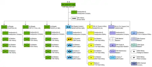 At the end of the Cold War the division was a joint Virginia Army National Guard (VAARNG) and Maryland Army National Guard (MDARNG) unit. Virginia provided the division's headquarters, the 1st and 2nd Brigade, the Division Artillery (with one MDARNG artillery battalion) and other minor units, while Maryland provided the 3rd Brigade, Aviation Brigade, 29th Infantry Division (with two VAARNG aviation companies), the Division Support Command (with one VAARNG aviation company) and other minor units.[26] The division was organized as follows: