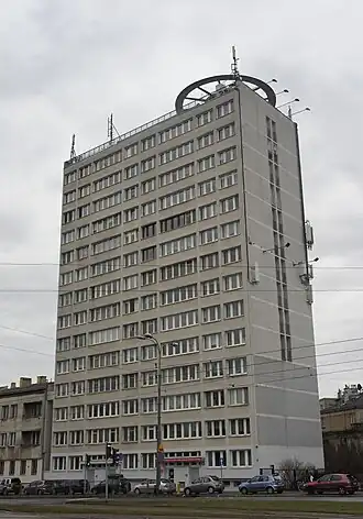 The building was commissioned by the housing cooperative of Wspólny Dach.[3] It was designed by architect Marek Leykam in modernist style, and was built between 1962 and 1963. The building was originally built with its south and north walls having elevation consisting fully of glass windows which reached from floors to ceilings. The glass walls were hold by concrete V-shaped s, one on each sides. The high-rise also had lift shafts partially covered in glass, through which were visible the loggias. In the building were located apartments and a library. It was also planned to place a revolving restaurant at the roof, which was never realized. The reminder of such plans is a concrete circle at the top of the building.[1][2]