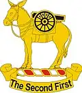• Description/Blazon: A gold color metal and enamel device 1 3/16 inches (3.02 cm) in height consisting of a wreath of alternating white and red supporting a gold mule with a black field piece on its back, all above a gold arced scroll inscribed "THE SECOND FIRST" in black letters. This insignia is to be worn in pairs.