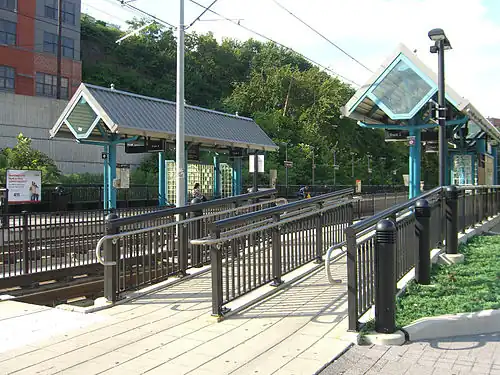The station opened on September 7, 2004. The right of way on which it is situated was originally part of the New York Central New Jersey Junction Railroad, which maintained a station there. It was later used by the Penn Central River Division and[3] the Conrail River Line before being abandoned to make way for the current system.[4] The station is located at the foot of the Hudson Palisades. In 2003, Jersey City agreed with a developer of a nearby factory-to-housing conversion to cover the cost of an outdoor public stairway from Jersey City Heights to the station. The stairway was never built and in June 2011 the city took responsibility for the project.[5] The steel steps were opened in November 2013.[6]