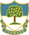 - Description: A gold metal and enamel device 1+1⁄4 inches (3.2 cm) in height overall consisting of a shield blazoned: Per fess Azure and Argent, on a low mount an oak tree fructed of thirteen acorns Proper. Attached below the shield a blue scroll inscribed "FORWARD" in gold letters.