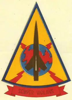 - ^ Approved 26 October 1960. Description: On a sector of a circle, its apex upward, Air Force golden yellow, bordered Air Force blue, two red lightning flashes in saltire throughout surmounted by a medium blue globe, land areas red; all surmounted by a black missile in pale pointing upward, details white; outlines and details black throughout. On a red scroll, edged and inscribed black, [the motto]. Significance: Against a background of the Air Force colors, ultramarine blue and golden yellow, two lightning bolts, crossed, represent the electronic control of the defense weapons system. The globe and land mass indicate the land area to be defended from air attack. The missile-shaped figure dominating the emblem is symbolic of the potential power for defense contained within the assigned BOMARC weapon.
