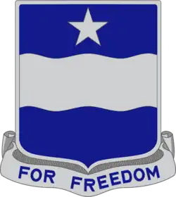 This Regiment was organized at Fort Sam Houston in 1916 and served along the Rio Grande during its first years. The shield is blue for Infantry, with a wavy fess to denote the Rio Grande and the lone star of Texas.