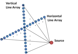 In order to estimate the location of a source in 3D space, two line sensor arrays can be placed horizontally and vertically. An example is a 2D line array used for underwater source localization.[16] By processing the data from two arrays using the maximum likelihood method, the direction, range and depth of the source can be identified simultaneously. Unlike the binaural hearing model, this method is similar to the spectral analysis method. The method can be used to localize a distant source.