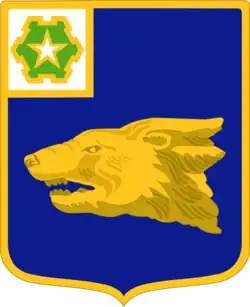 This Regiment was organized in 1917 from the 36th Infantry, shown by the canton. During World War I it was in the 14th Division, shown by the wolverine's head, the unofficial insignia of that Division.