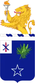 The Regiment was organized in 1917 at Fort Benjamin Harrison, Indiana, by transfer of personnel from the 10th Infantry. The shield is blue for the Infantry and the parentage of the Regiment is shown by the canton. The early station of the Regiment was the Philippines; this is indicated by the abaca tree which is a source of great wealth in the Islands and which grows native in no other place. The star in the base of the shield is the blue star of the old First Philippine Infantry. The crest of the Harrison family, General and President William Henry and General and President Benjamin Harrison, is a lion. This is also the upper body of the crest of the Philippines, a sea lion. The device of the State of Indiana is a torch. These are combined to form the crest of the Regiment.