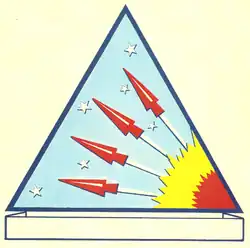 - ^ Approved 5 May 1960. Description: On a light blue equilateral triangle, one point upwards, spattered with white stars, an Air Force golden yellow fire ball with a red center issuing from sinister (left) base from which four red missiles radiate to dexter (right), highlights and jet exhaust trails white; outlines and details AF blue throughout; all within a narrow Air Force blue border. Significance: Against a background of sky blue spattered with stars to represent the primary theater of operations, four red missiles (representing the four steps in air defense: detection, interception, identification, and destruction) issue from a fire ball, all representing the unit's overall mission, to equip, administer, and train assigned or attached personnel and provide a force in a maximum state of readiness for use in air defense. The three sides of the triangle symbolize the respective tasks performed by operations, materiel, and administration. The emblem bears the squadron colors, blue and golden yellow.