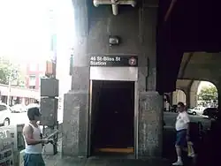 The 46th Street–Bliss Street station (announced as the 46th Street station on trains) is a local station on the IRT Flushing Line of the New York City Subway. Located at the intersection of 46th Street and Queens Boulevard in Sunnyside, Queens, it is served by the 7 train at all times.