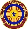 Distinctive Unit Insignia[6] is a gold color metal and enamel device made of three circles of brick red, blue and gold with a blue fleur-de-lis in the center and the motto "FREEDOM THROUGH MOBILITY. The distinctive unit insignia was originally approved for the 4th Transportation Brigade on 9 October 1975.