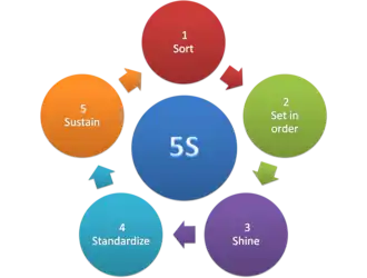 5S (Five S) is a workplace organization method that uses a list of five Japanese words: seiri (整理), seiton (整頓), seisō (清掃), seiketsu (清潔), and shitsuke (躾). These have been translated as 'sort', 'set in order', 'shine', 'standardize', and 'sustain'.[1] The list describes how to organize a work space for efficiency and effectiveness by identifying and sorting the items used, maintaining the area and items, and sustaining the new organizational system. The decision-making process usually comes from a dialogue about standardization, which builds understanding among employees of how they should do the work.