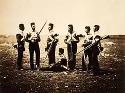 By the end of February the regiment had been rearmed with the new Enfield rifle, replacing the smoothbore musket they had started the campaign with.[116] A second, much larger sortie of some 2,000 men which took place on the night of 11 May was faced by detachments from the Rifle Brigade, 46th Foot and 250 men from the 68th. A party of Russians succeeded in spiking a gun but were driven off with the loss of six dead and 22 wounded. Pte John Byrne was again prominent, and Captain Hamilton was to win the Victoria Cross.[117][118]